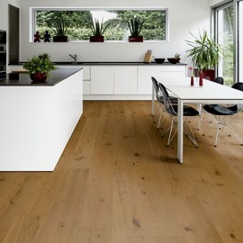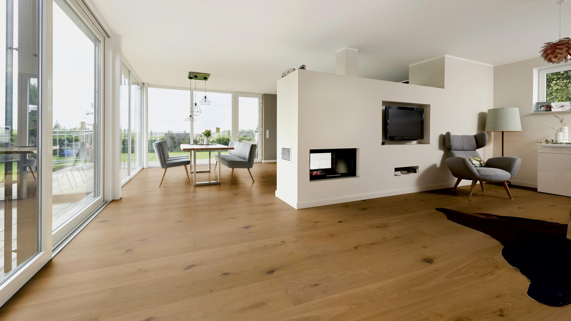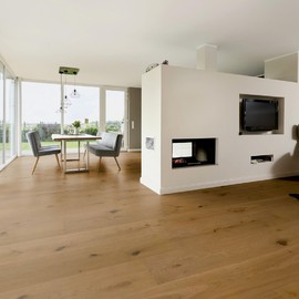 Экстраширокий размер и ультраматовое покрытие доски Hywood Noblesse подчеркивает красоту натурального дерева и хорошо смотрится в больших помещениях.