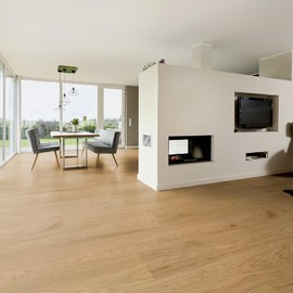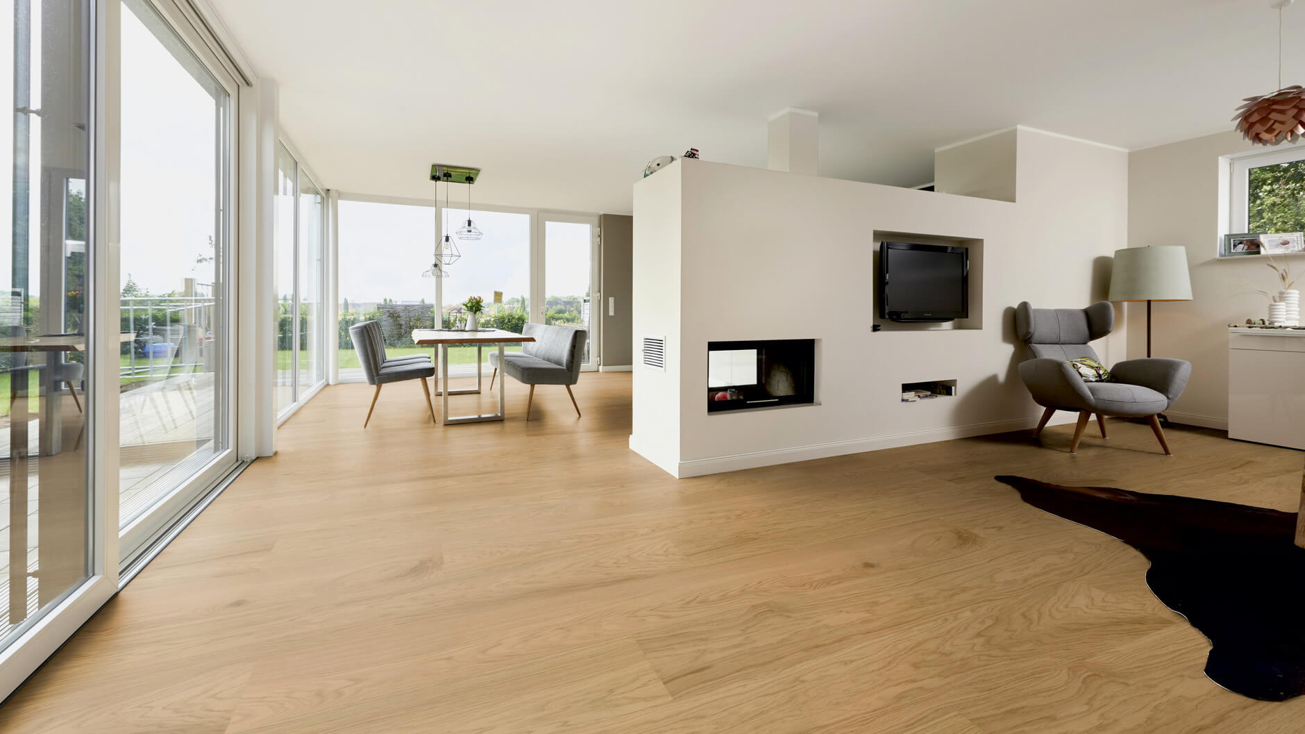 Экстраширокий размер и ультраматовое покрытие доски Hywood Noblesse подчеркивает красоту натурального дерева и хорошо смотрится в больших помещениях.
