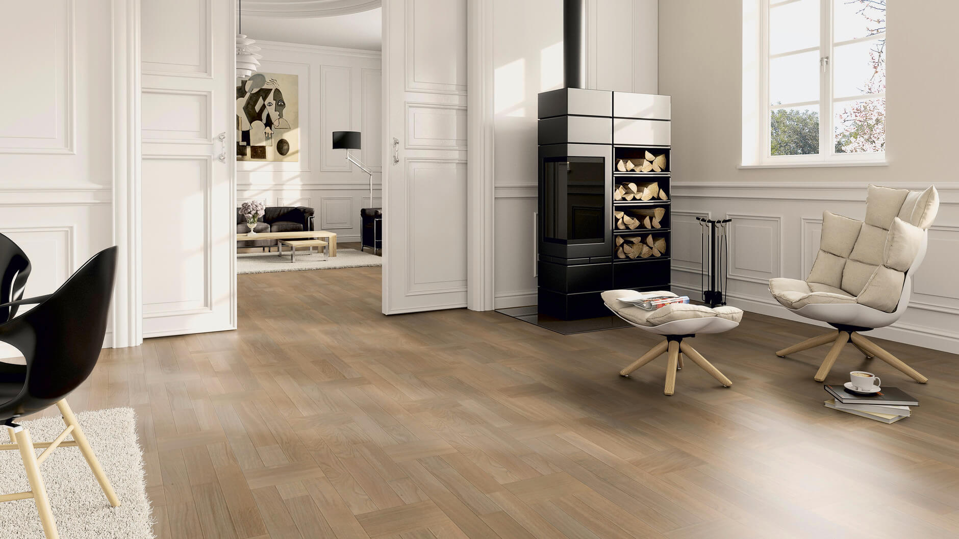 Трехполосная паркетная доска со специальными фасками из коллекции «Contours» создают неповторимый рисунок пола. Фаска подчеркивает каждую ламельку, из которой состоит паркетная доска, и создает неповторимый рисунок. Обработка щеткой и натуральным маслом дополнительно подчеркивают каждую доску. Результат - высококонтрастные акценты и эксклюзивный рисунок.